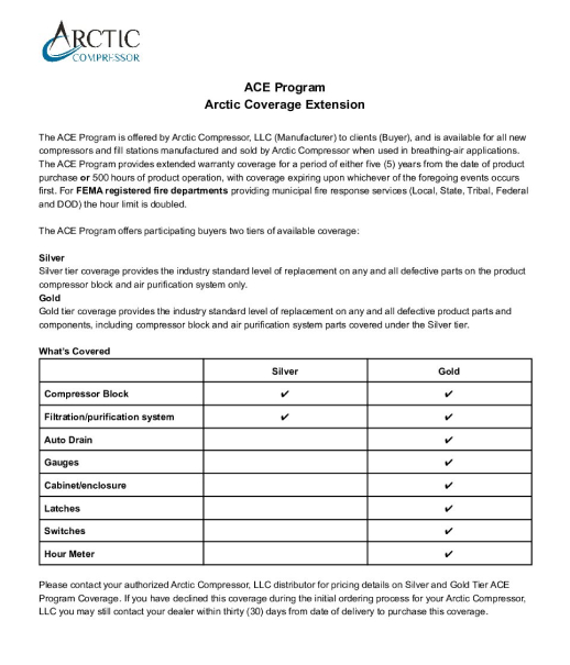 Welcome to Arctic Compressor’s Warranty Programs page, where we offer top-of-the-line coverage tailored for your compressor equipment. At Arctic Compressor, we understand the critical role that your compressor plays in your operations, which is why we have developed industry-leading warranty programs to provide you with the ultimate peace of mind. Our commitment to excellence ensures that when you choose Arctic Compressor, you’re not just acquiring equipment but investing in reliability and longevity for your compressor systems. Our comprehensive warranty programs safeguard your compressor investment and offer exceptional value by covering unforeseen repairs and maintenance costs. With Arctic Compressor’s warranty programs, you can trust that your compressor equipment remains protected and operational, even in the face of unexpected challenges. Experience the assurance and confidence superior coverage can bring – choose Arctic Compressor for all your compressor system needs.